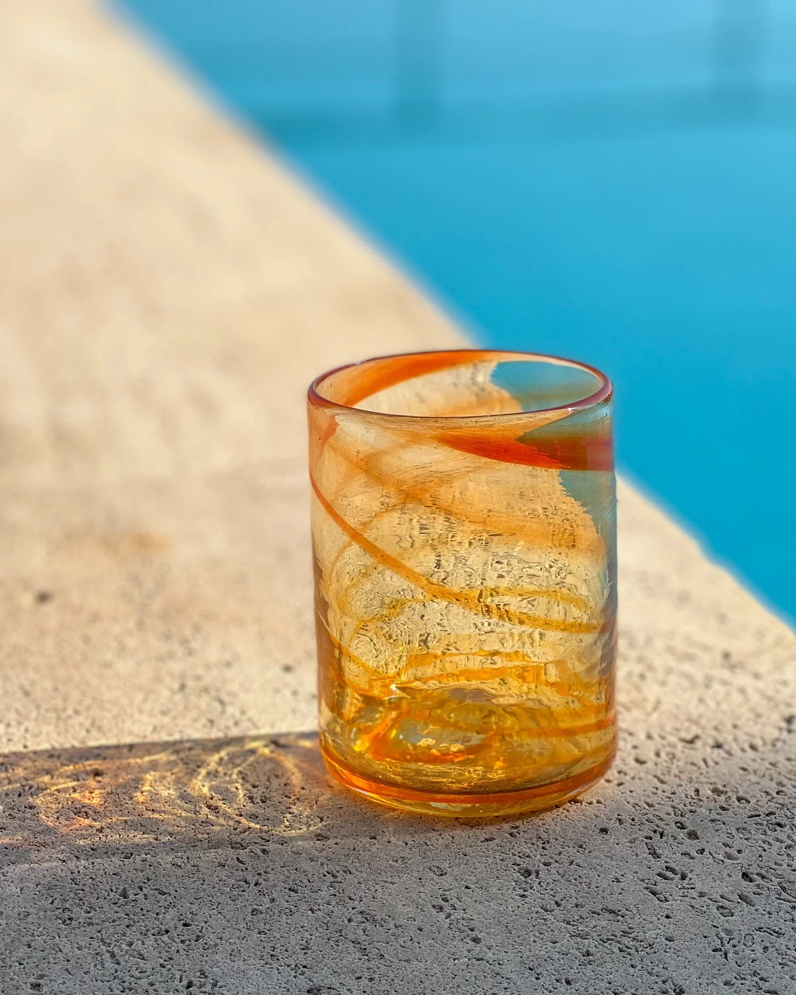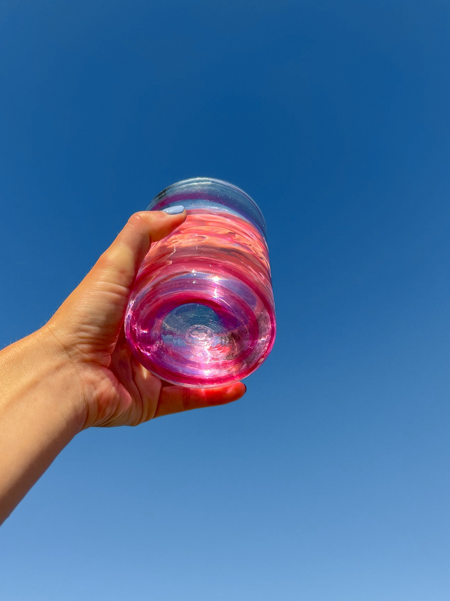 Mouth blown tumbler glasses and matching jugs, all individually created with recycled glass by skilled artisan glass blowers on the majestic Balearic Island of Mallorca.