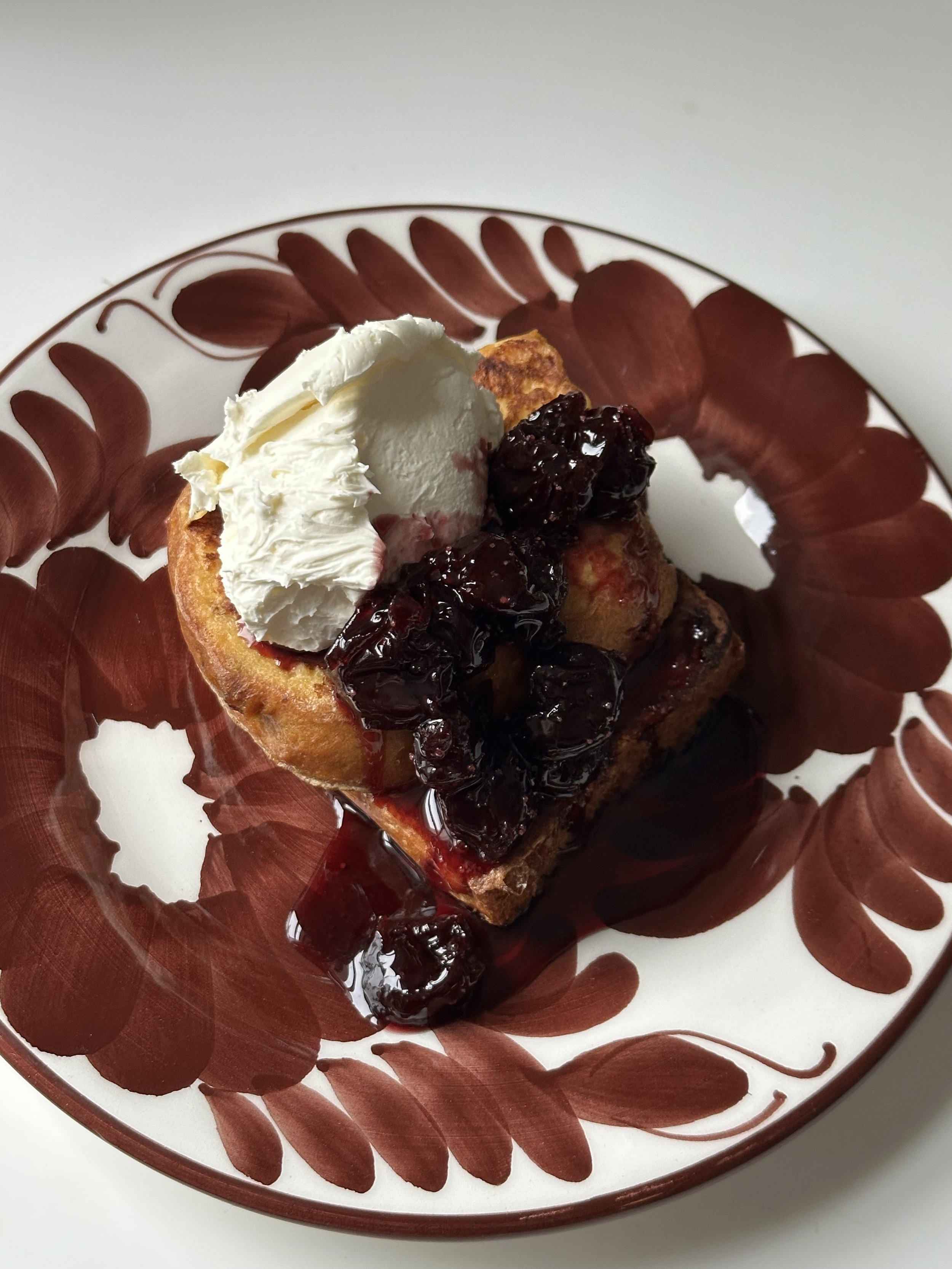Captured beautifully by Madeleine Place, this table is everything we love about those quiet, indulgent mornings — golden French toast piled high with stewed winter fruits and whipped cream, coffee still steaming, and our Woven Rosa Florita dessert plates in espresso setting the scene.